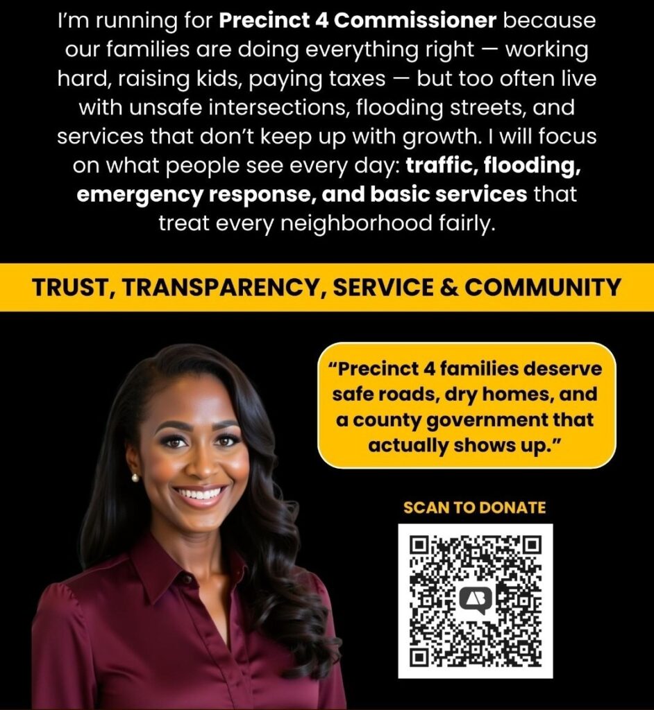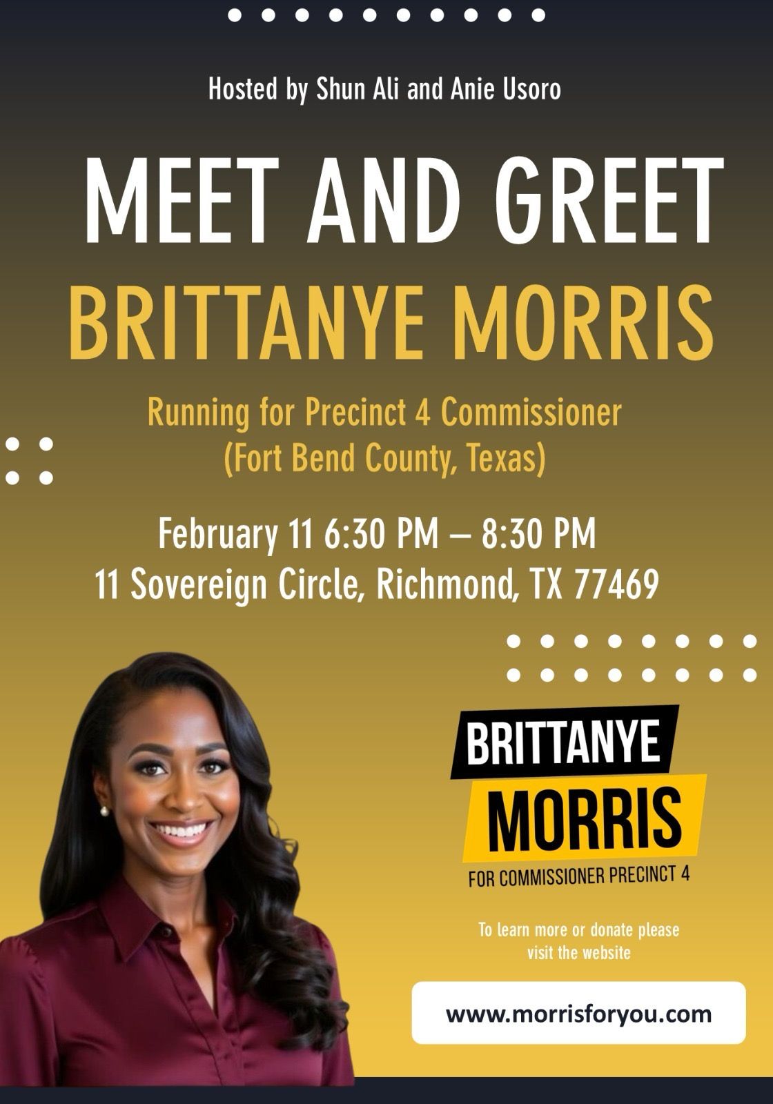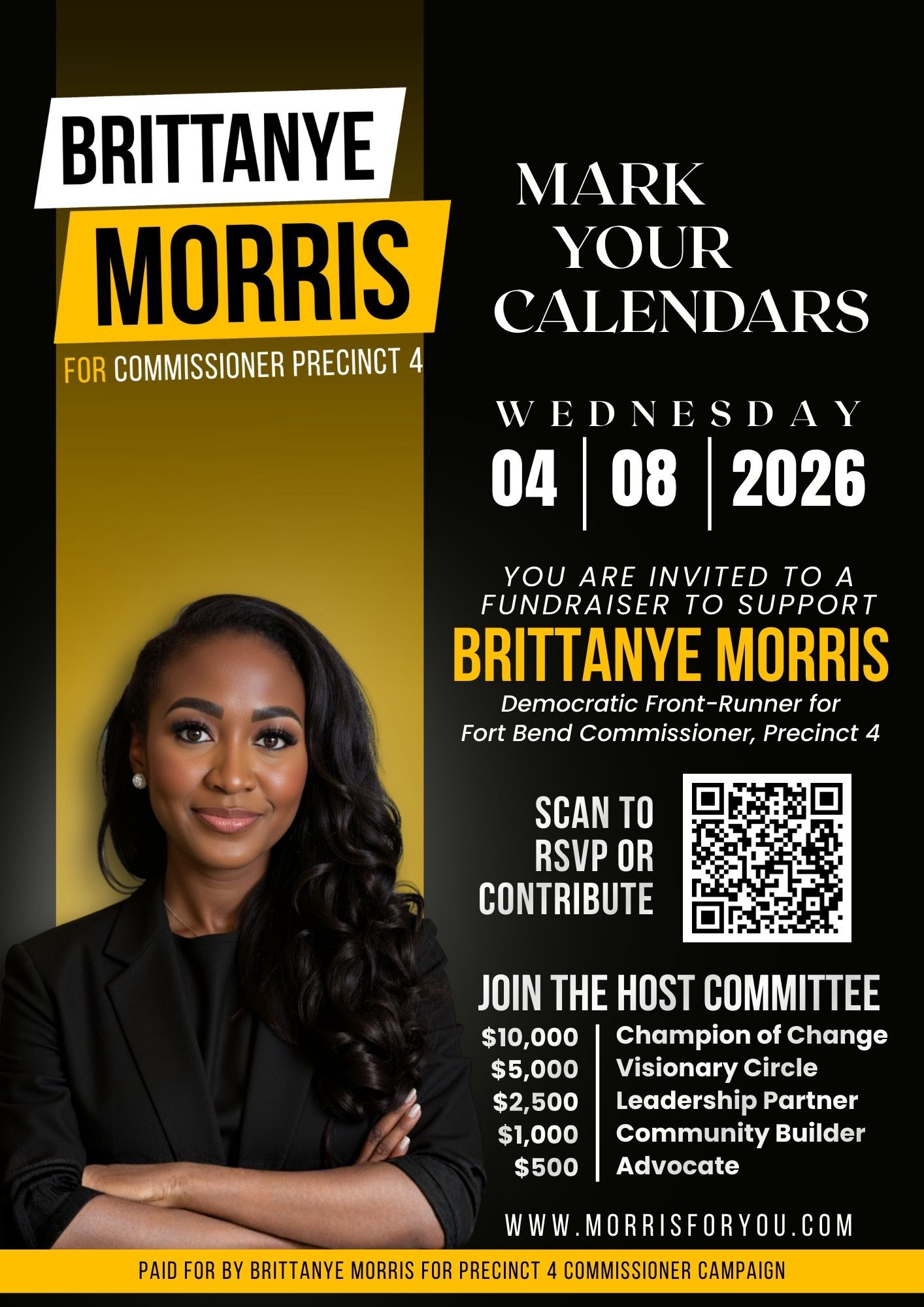 Your voice matters — and your involvement makes a real difference. By supporting Brittanye Morris for Fort Bend County Commissioner, Precinct 4, you’re helping ensure county government is fair, responsive, and focused on serving the people of this community.